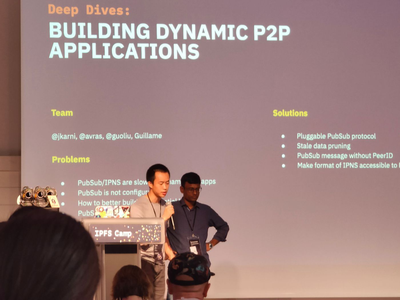 另一次參加了關於動態數據的討論,同組的是radicle(一個非常酷的項目!)的開發者和IIT Bombay的CS教授,一起討論目前IPFS處理動態數據上的局限及可能的改良措施。目前IPFS中的動態數據,主要是通過IPNS提供指針,指向不同的IPFS哈希值,并由IPNS發佈者私鑰簽署驗證。但目前IPNS的更新速度非常緩慢。解決IPNS效率問題的一個方案是整合進PubSub機制,目前已經開發完成,還在測試之中。