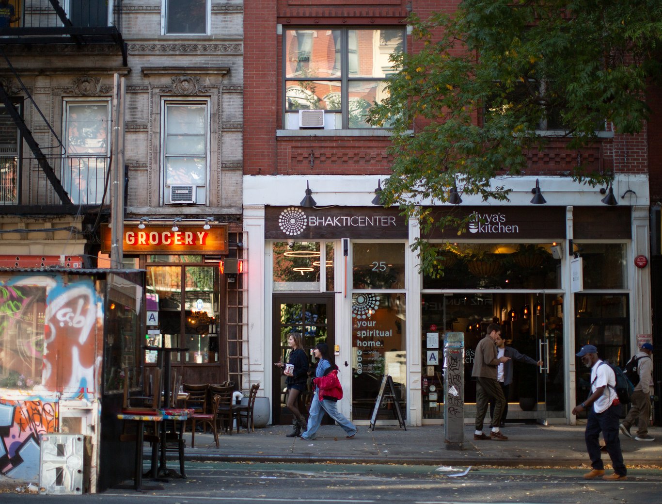 东村在曼哈顿的东南角。在寸土寸金的南曼哈顿,这里是相对便宜的,容纳了不少独立店铺和年轻人。东村的夜晚是年轻人的盛会,餐厅的座椅沿街铺开,一排排灯红酒绿。每个街区都有那么一家酒吧,要用自己的音乐覆满街道。走在街道上,每几步就换一次背景音乐,回荡着不同的语言,仿佛穿过一个个夜色中涌出的小世界。